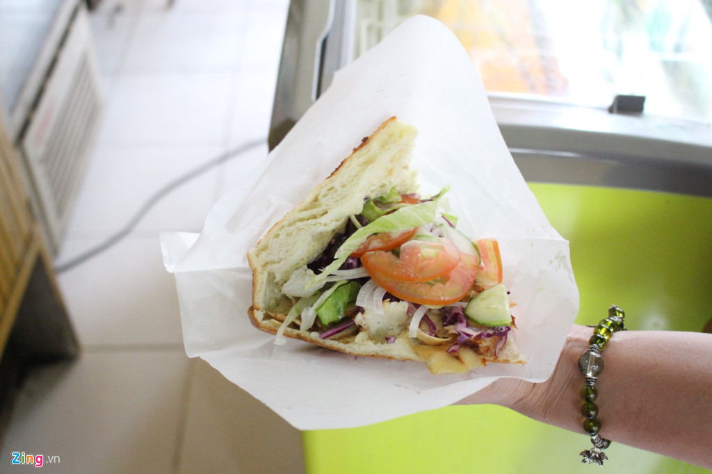 Món bánh mì hình tam giác tại đây được ăn kèm hỗn hợp thịt heo - gà theo tỷ lệ nhất định và hàng loạt các loại rau chua từ hành tây, bắp cải tím, bắp cải trắng, cà chua, dưa leo... Giá bánh 35.000 đồng một cái.