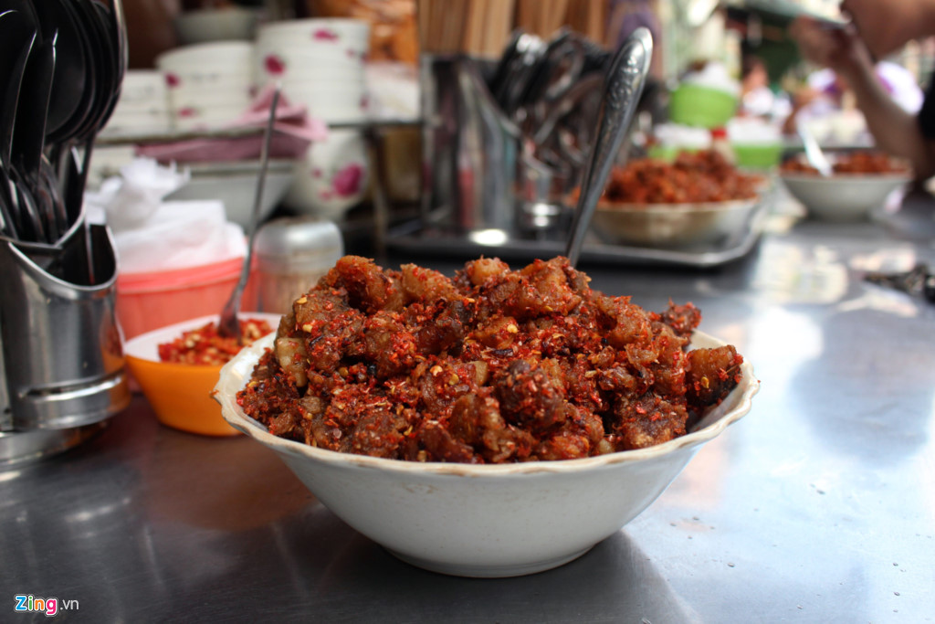Ngoài phở, quán cũng khiến thực khách chảy nước miếng với chén tóp mỡ đỏ au. Bạn có thể ăn vã hay trộn chung với phở. Một tô phở chua có giá 40.000 đồng.