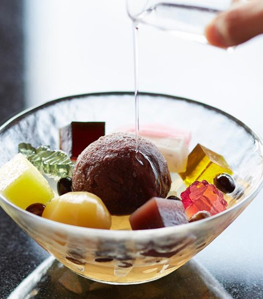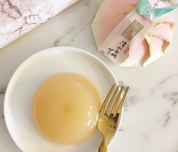 Món thạch tráng miệng theo mùa này được làm từ nước ép từ đào Hakuto kết hợp với nước suối khoáng. Thạch có kết cấu mịn và mềm, được đặt trong chiếc hộp hình quả đào bắt mắt.