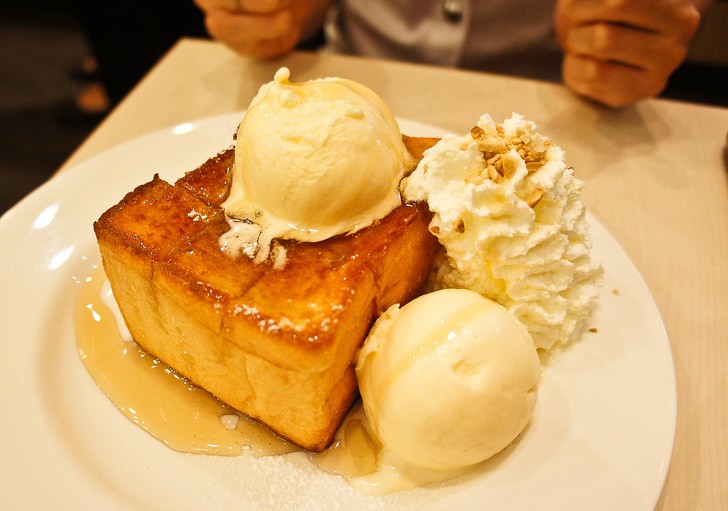 Người Anh sẽ mê mệt món bánh mì nướng to, ngọt và ngon như thế này vào buổi sáng. Bánh mì tráng một lớp mật ong caramen với trái cây và kem trang trí bên trên.