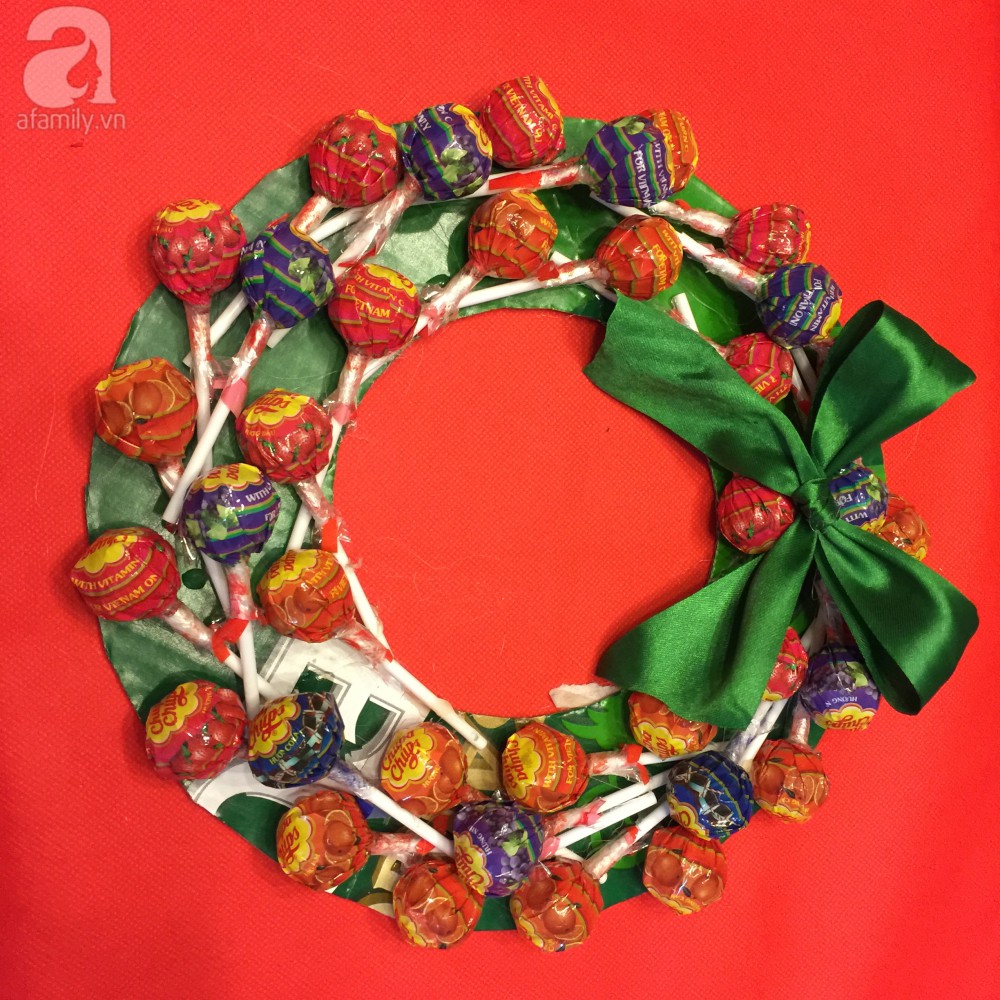 Bạn lấy bìa cứng cắt thành hình tròn sau đó dùng băng dính hai mặt dán kín. Bạn gắn kẹo xung quanh vòng tròn cho đều và trang trí bằng nơ lụa.