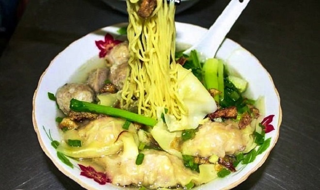 Nhân sủi cảo được làm từ một loại cá đặc biệt nhào nặn chung với thịt xay, bên trong là một con tôm to bóc vỏ, bọc bên ngoài là vỏ hoành thánh được cán tay thủ công. Món mì sủi cảo có nước lèo ninh từ xương heo và tôm. Một vắt mì tươi, ít rau cải ngọt, thịt heo luộc, khô mực, tóp mỡ... được cho vào tô, cùng với những viên sủi cảo, tạo nên tô mì hấp dẫn, đậm đà. Mì sủi cảo được bán nhiều nhất ở đường Hà Tôn Quyền với hàng chục cửa hàng, giá một phần từ 40.000 đồng. Ảnh: diadiemanuong.