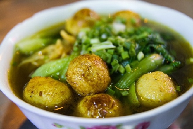 Đây là kiểu mì rất phổ biến ở Hong Kong, được biến tấu một chút cho hợp với khẩu vị người Việt. Nước dùng gồm nước ninh từ xương và nước cà ri, có vị thơm nồng của ngũ vị hương, hoa hồi, vị cay nhẹ, hơi tê nơi đầu lưỡi của tiêu đen. Cá viên được chiên sẵn trước khi thả vào nồi cà ri, lúc múc ra tô cho khách ăn thì ngấm đều nước sốt sánh và đậm đà. Sợi mì tươi vàng ươm, có độ dai nhất định. Mì cá viên được bán ở đường Nguyễn Trãi (quận 5), giá 50.000 đồng một tô nhỏ. Ảnh: Benz.
