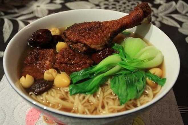 Mì vịt tiềm là món ăn của người Hoa nhưng rất phổ biến và được nhiều người yêu thích ở TP HCM. Dạo quanh các con phố ở quận trung tâm, bạn sẽ tìm thấy những quán mì vịt tiềm từ bình dân đến sang trọng. Thịt vịt được chiên sơ rồi tiềm trong nồi nước lèo gồm xương hầm và các vị thuốc bắc cho đến khi chín mềm. Tô mì có thêm rau cải, nấm đông cô. Bạn có thể thưởng thức ở các tiệm mì gốc Hoa đông khách như Hải Ký, Lương Ký Mì Gia, Quảng Huê Viên… Giá một tô từ 50.000 đến 100.000 đồng tùy lượng vịt, đùi, cánh. Ảnh: Anh Trần.