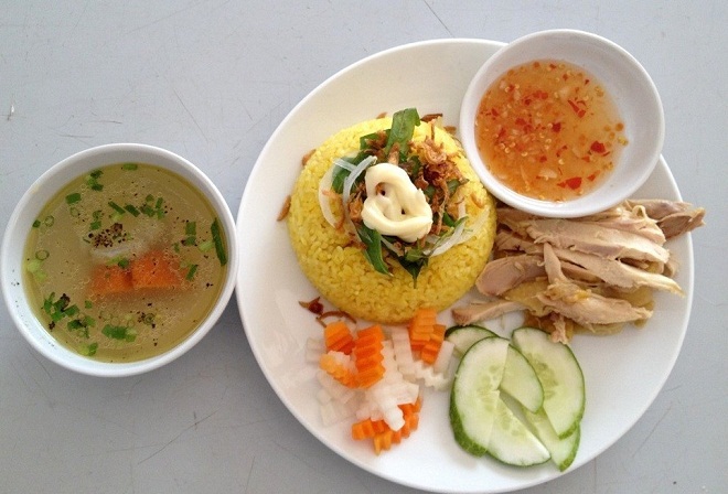 Ngoài phần cơm dẻo thơm nấu bằng nước luộc gà, cơm gà Phú Yên còn gây ấn tượng bởi thứ nước chấm riêng biệt và những miếng thịt xé thơm ngon. Bên cạnh những nguyên liệu chính là nước mắm, chanh, đường, tỏi, ớt được xay nhuyễn, công thức có một chút thịt gà xay, tạo nên độ béo ngậy và ngọt. Cơm gà Tuyết Nhung trứ danh TP Tuy Hòa đã có ở đường Tân Sơn Nhì, quận Tân Bình. Một phần cơm gà giá 22.000-35.000 đồng, tùy phần gà xé, gà chặt, đùi gà… ăn kèm rau răm, dưa chuột, hành tím ngâm đúng vị Phú Yên. Ảnh: Danphuyen.