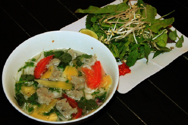 Có nhiều loại ăn kèm bánh hỏi nhưng lòng heo mới là sự kết hợp tạo nên đặc trưng cho ẩm thực Phú Yên. Bánh hỏi được làm từ bột gạo, sợi nhỏ mảnh mai, kèm đĩa lòng và thêm rau sống tươi xanh, chén mắm pha gia vị vừa phải sẽ tạo nên hương vị đậm đà đặc biệt. Khi ăn, cách phổ biến nhất là cuốn bánh tráng với bánh hỏi, lòng và rau sống. Thực khách có thể ăn kèm một bát cháo trắng thơm ngon. Bánh hỏi được bán ở quán Con Gà Mái đường Nguyễn Văn Đậu, giá 90.000 đồng cho hai người ăn. Ảnh: CGM.