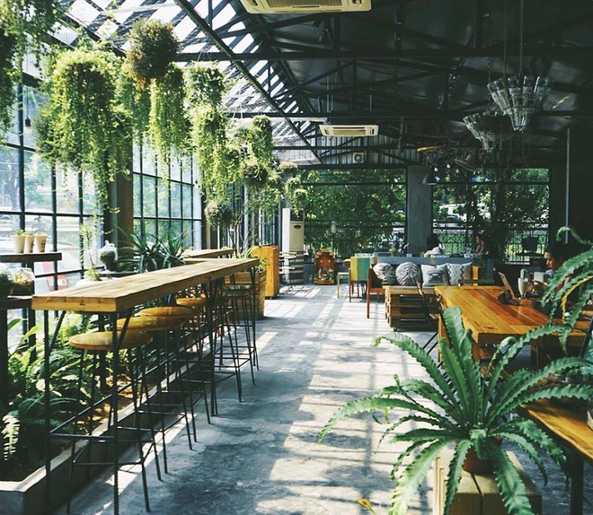 Nằm trên con phố Vạn Bảo đông đúc, quán trông na ná một khu vườn kính bởi không gian ngập tràn cây xanh. Bàn ghế màu gỗ và tường xám xi măng tạo sự nhẹ nhàng, thoải mái, trên bàn luôn đặt nhiều chậu cây xinh xắn. Quán rất đông khách nên có thể bạn phải đợi khá lâu sau khi gọi đồ uống. Địa chỉ: số 50 Vạn Bảo, quận Ba Đình. Ảnh: Gardenista.