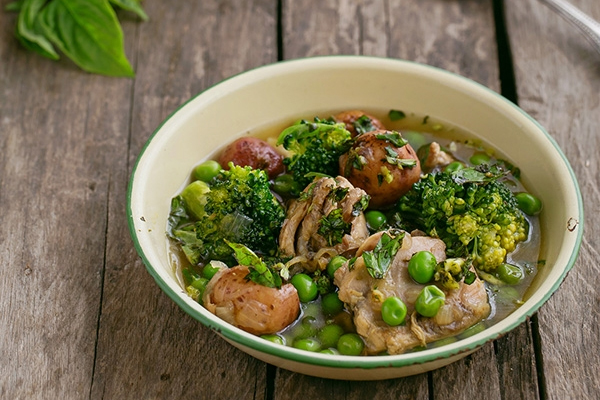 • Thịt gà hầm rau củ với sự kết hợp của các loại rau xanh, khoai tây, đậu Hà Lan tạo nên một món ăn đầy đủ dinh dưỡng, ngon miệng và đậm hương vị mùa xuân.
