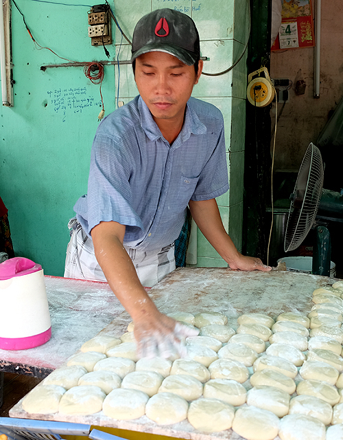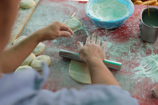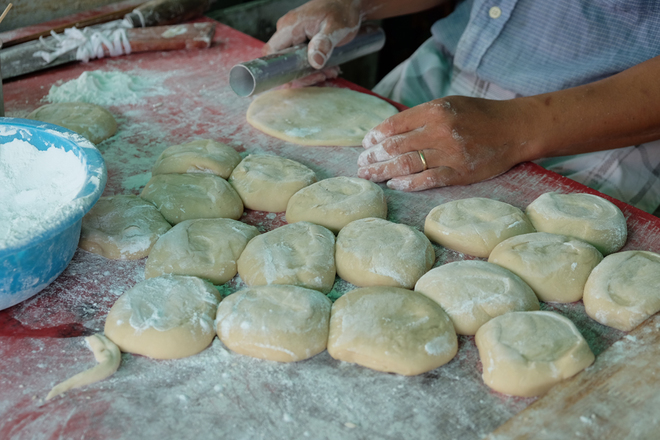 Bột bánh tiêu sau khi trộn chung các loại gia vị sẽ nắn thành hình tròn bằng quả cam, rắc bột khô bên ngoài để không bị dính.