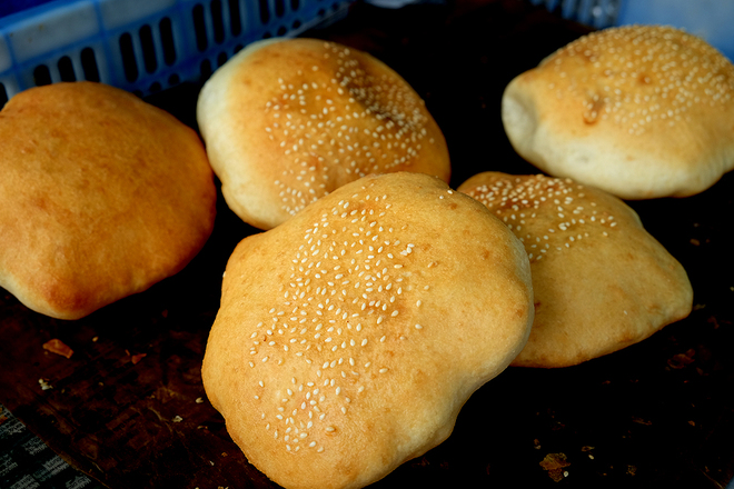 Phần bột, rắc mè trắng lên một mặt trước khi mang đi chiên. Bánh được cho vào chảo dầu to, dầu đun ở nhiệt độ cao. Khi chiên, bánh phồng to lên, khi bên ngoài vừa ngả màu vàng thì vớt ra để cho ráo dầu.