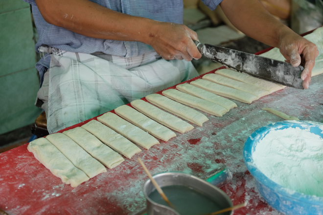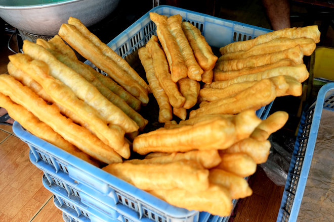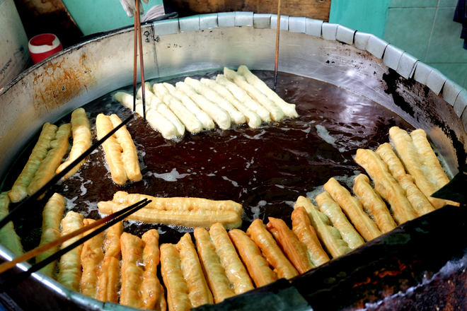 Chiên trong chảo dầu đen ngòm, thế nhưng món bánh tiêu giò chéo quẩy nóng giòn thơm phức cả thế kỷ qua vẫn là món ăn vặt quen thuộc của nhiều người Sài Gòn.