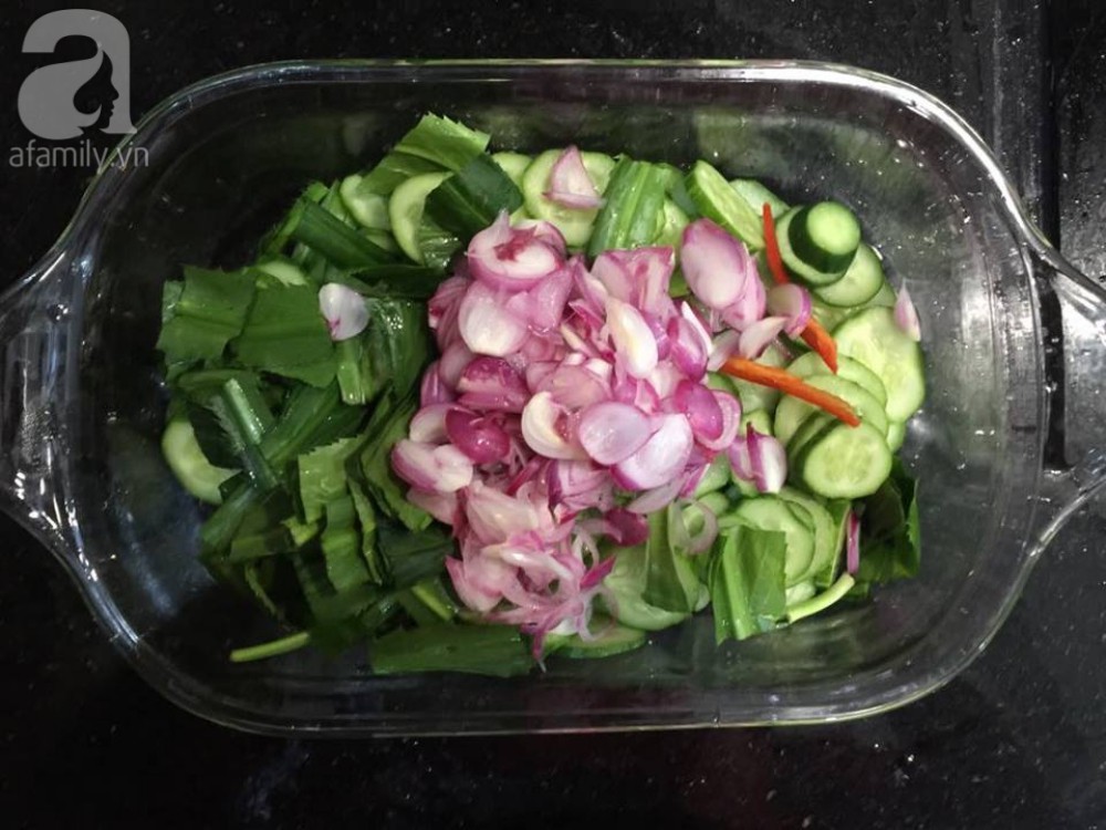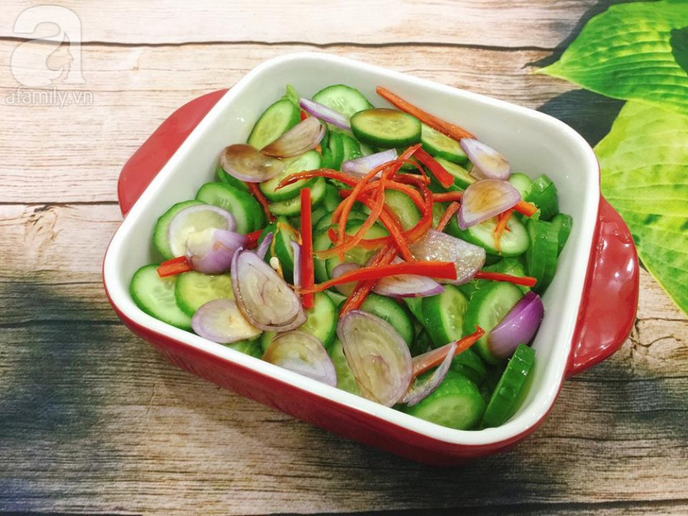 Hành tím bóc vỏ thái lát mỏng, ngâm vào bát giấm tầm 30 phút cho bớt mùi hăng, vớt ra để ráo, bỏ nước ngâm đi. Dưa chuột rửa sạch, thái lát mỏng. Ớt sừng bỏ hạt, thái chỉ, mùi tàu rửa sạch cắt khúc 3 cm. Cho tất cả nguyên liệu vào một tô lớn.