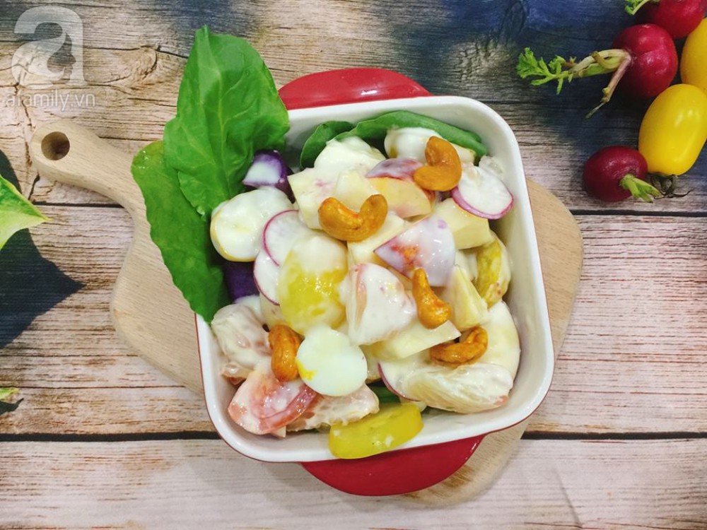 Cho rau và các loại hoa quả đã sơ chế vào tô lớn, cho hỗn hợp xốt sữa chua đã trộn ở trên vào, đảo nhẹ, cho vào ngăn mát tủ lạnh 30 phút rồi bày lên đĩa và thưởng thức.