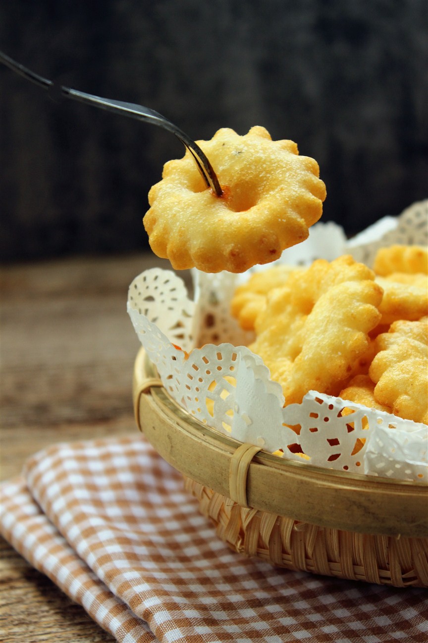 Cán bột thành tấm dày khoảng 0,3cm. Dùng khuôn nhấn để cắt bánh và tạo hành chiếc bánh. Đun nóng dầu ăn trong chảo, cho bánh đã cắt vào chiên chín vàng đều thì vớt ra đĩa có lót giấy thấm dầu là xong.