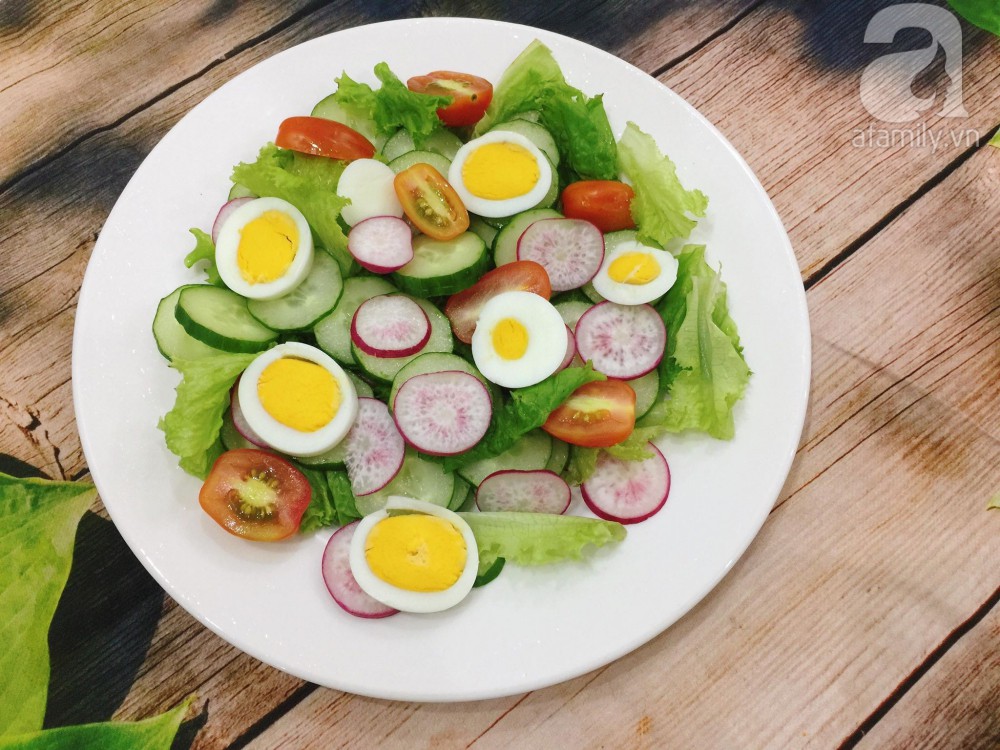 Xà lách, dưa chuột, củ cải đỏ, trứng luộc.