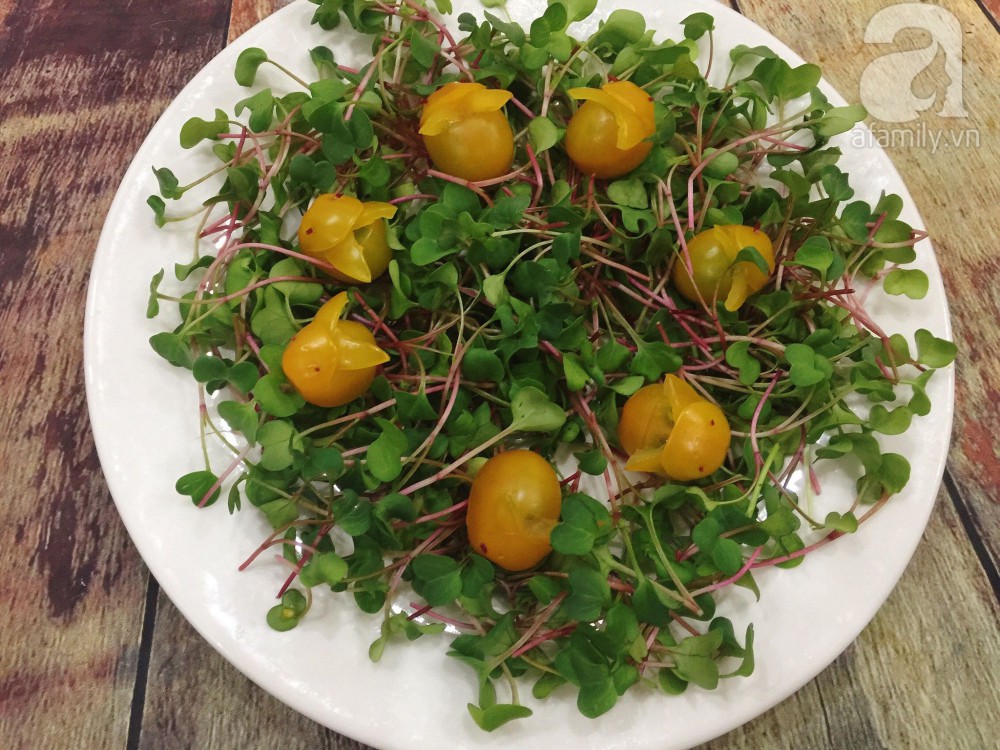Các loại rau củ rửa sạch để ráo. Cà chua, dưa chuột thái miếng mỏng, xà lách, rau mùi cắt khúc 3cm, trứng luộc chín, cắt miếng cau. Xếp tất cả lên đĩa.