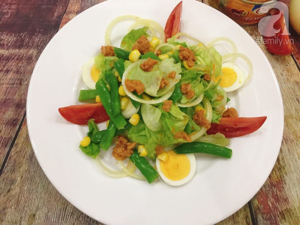 Cho tất cả các nguyên liệu đã sơ chế vào một tô lớn, chế nước xốt vào trộn đều. Cho ra đĩa, rắc cá ngừ lên trên và thưởng thức.