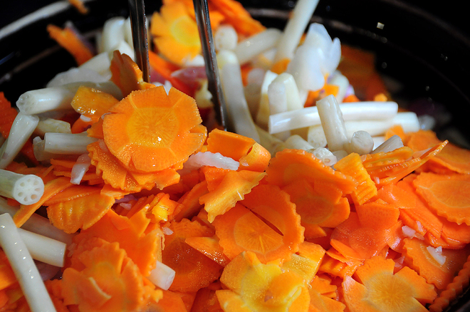 Bên cạnh nước mắm, đồ chua là thứ khiến đĩa cơm tấm trở nên ngon hơn. Món đồ chua của cơm tấm miền Nam thường được làm từ ngó sen, củ cải trắng, cà rốt. Mọi thứ có thể xắt sợi hoặc khoanh tròn tỉa cánh hoa, rồi ngâm với nước giấm pha đường muối.