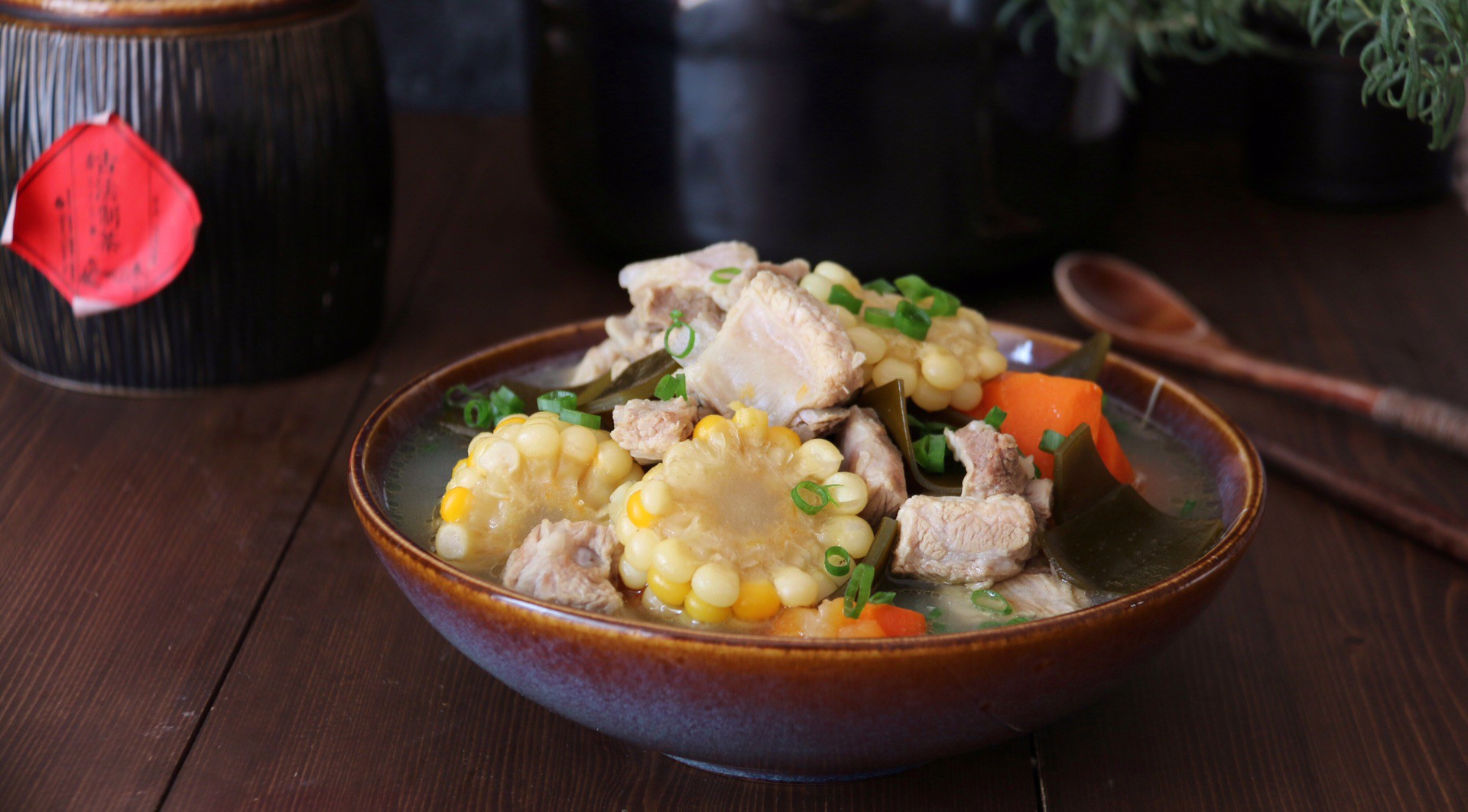 Cho sườn, cà rốt, ngô, rong biển vào nồi hầm. Cho 1 thìa cafe muối, 1 thìa cafe hạt nêm. Ninh canh sườn khoảng 20 phút thì mở nồi hầm, nêm nếm cho vừa miệng rồi tắt bếp.