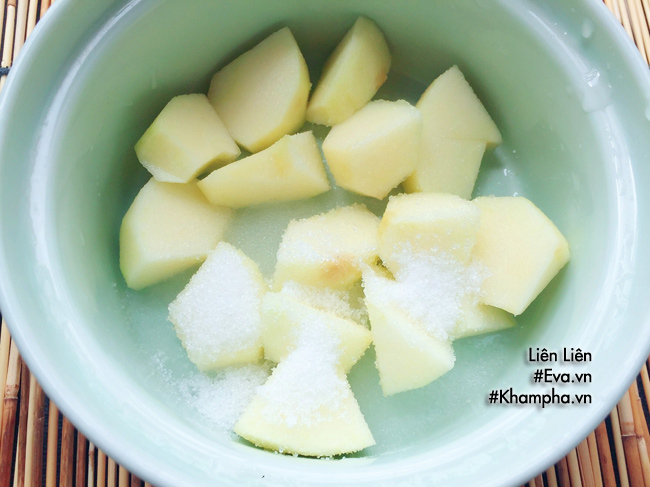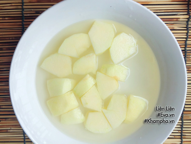 Bước 2: Táo gọt vỏ, thái miếng nhỏ ngâm vào nước muối pha loãng.