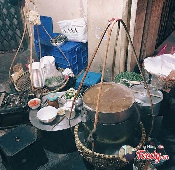 Quán phở này vô cùng sơ sài và giản đơn. Nồi nước dùng một bên, bên kia là nồi nước sốt vang rồi bếp than tổ ong, bát đũa… tất cả đều được cô chủ quẩy bằng quang gánh.