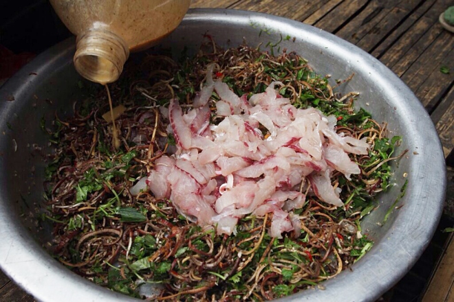 Sau khi cho đầy đủ gia vị, cá được bóp với nước măng chua. Nước chua sẽ làm thịt cá chín. Yêu cầu của hỗn hợp ăn kèm này là có độ chua vừa đủ nhưng phải cay, nồng và có mùi thơm đặc trưng, không tanh.