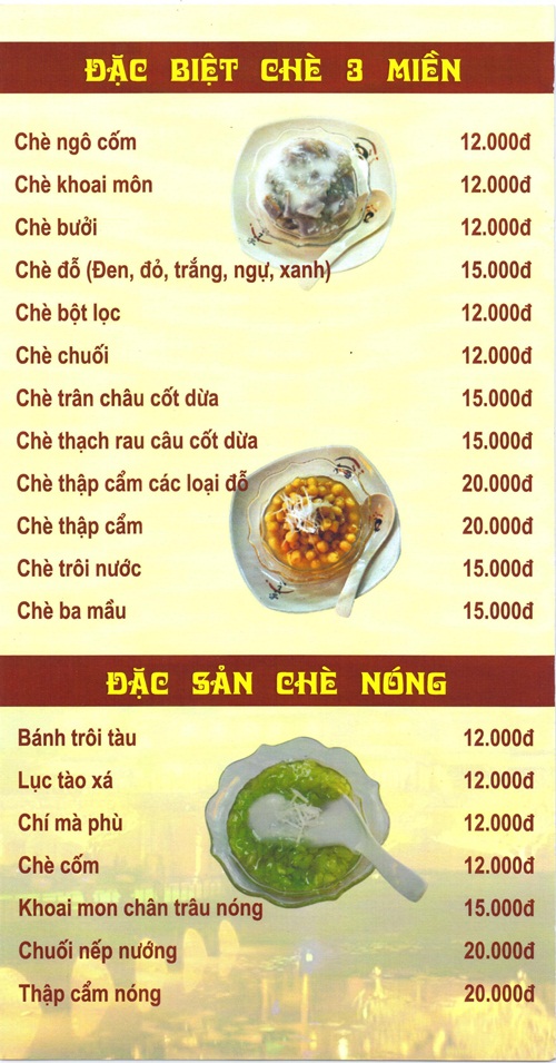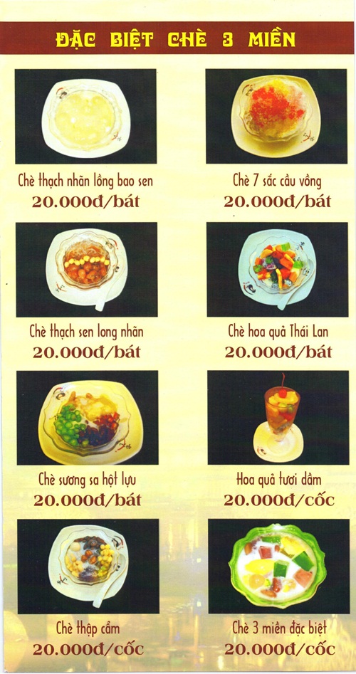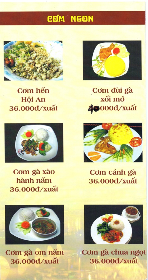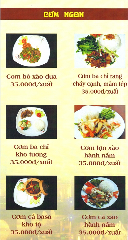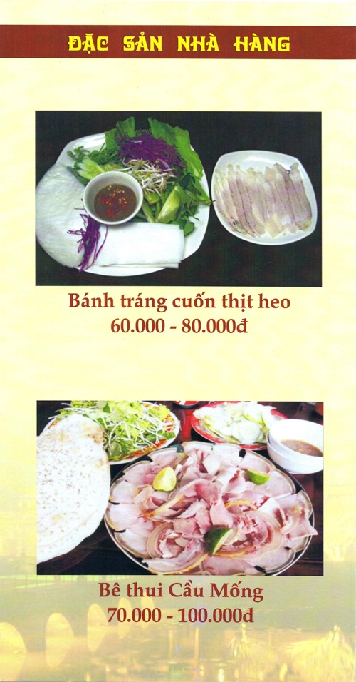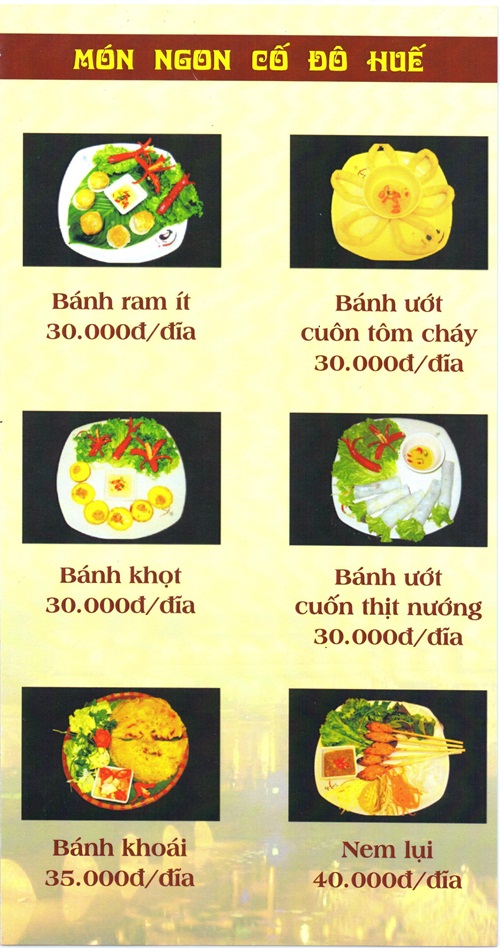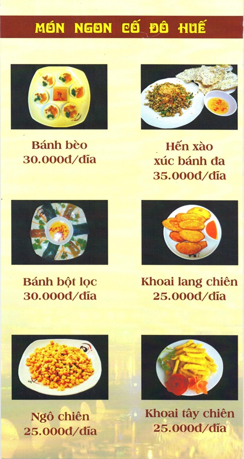 Nhà hàng phục vụ các món ăn đậm đà hương vị Huế như các loại bánh đặc trưng của miền đất cố đô: bánh bột lọc, bánh tráng cuốn thịt heo, bánh bèo, bún bò Huế…., các loại chè Huế thơm ngon bổ dưỡng. Ngoài ra nhà hàng còn có các món cơm ngon mang hương vị riêng của Huế. Đặc biệt nhà hàng còn phục vụ các loại lẩu cá miền Trung (cá kèo, cá chìa vôi, cá đuối, các tắc kè, cá bã chầu) và các loại lẩu nướng.
