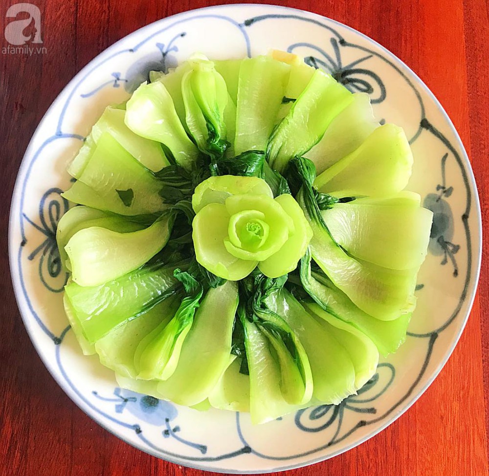 Để lại một búp rau không tách rời hoàn toàn khi cho vào nồi luộc, lúc bày lên đĩa bạn lật ngược lại là có bông hoa rất xinh rồi!