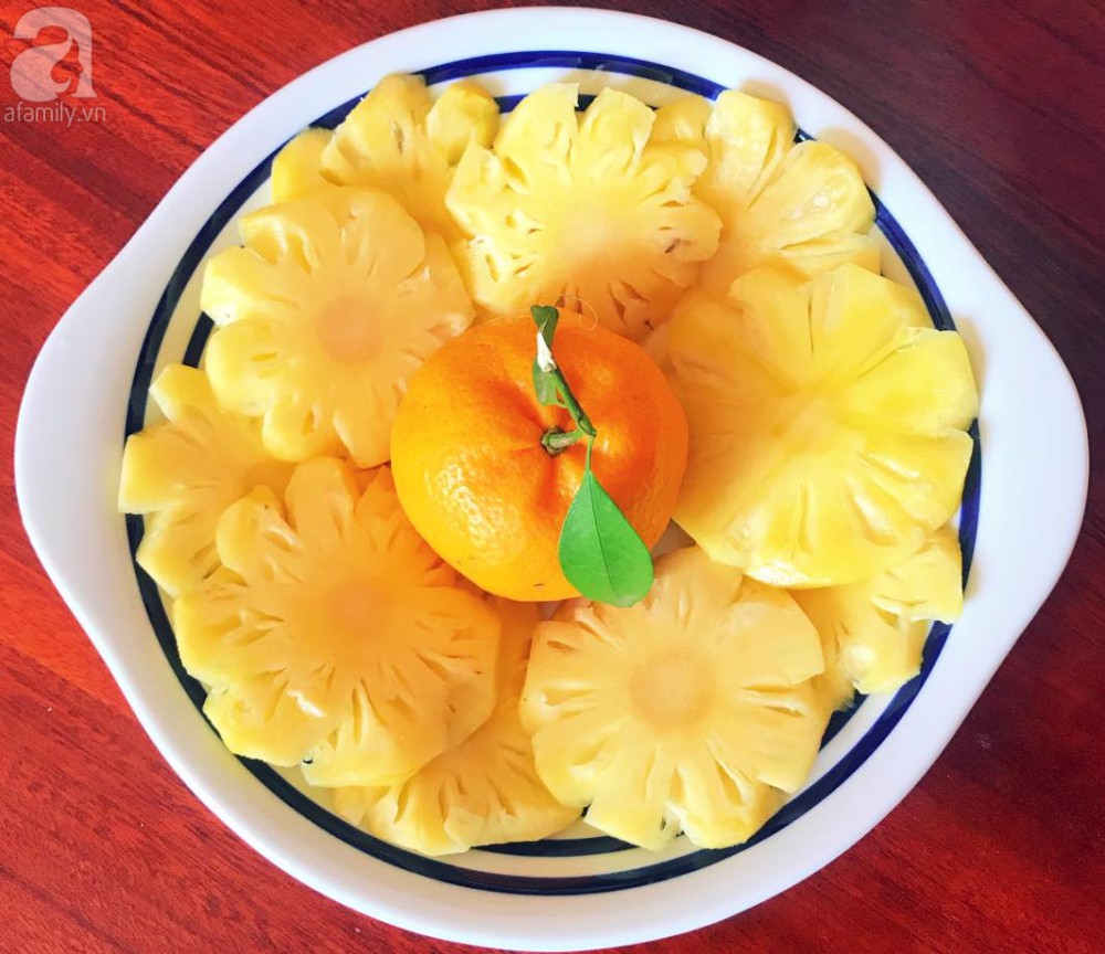 Tráng miệng đơn giản với vài lát dứa, thay vì cắt dọc quả dứa bạn cắt ngang là có ngay những bông hoa dứa siêu dễ thương rồi!