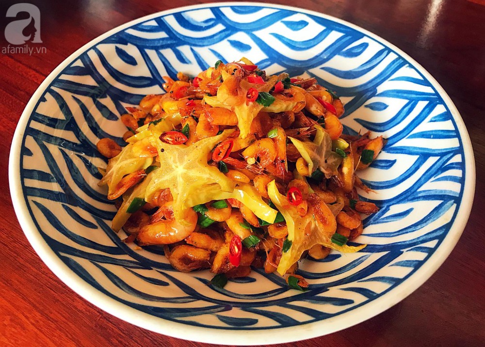 Tôm bỏ lên chảo đảo thật khô rồi mới cho dầu ăn và dầu điều, gia vị bột và khế chua thái lát vào đảo săn tôm lại (dầu điều giúp màu tôm đẹp và hấp dẫn hơn). Sau đó cho hành thái lát vào là xong.
