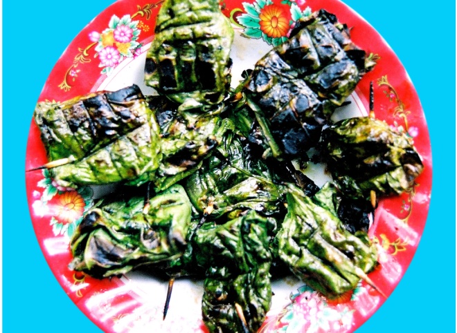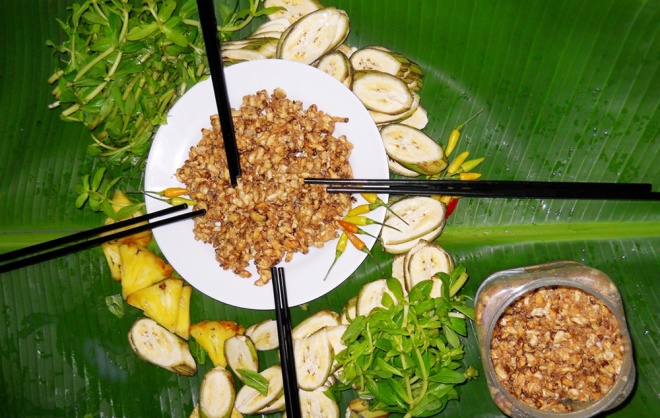 Mắm ong cũng được gói trong lá mướp rồi đem nướng trên lửa than, tạo hương vị độc đáo.