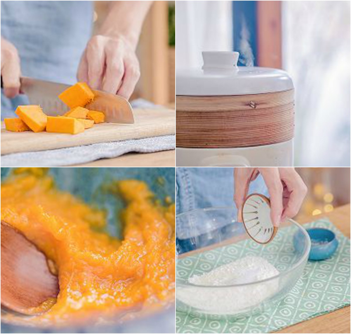 1. Gọt vỏ bí ngô sau đó thái thành từng miếng nhỏ. Đun nước sôi, thả bí vào nồi hấp khoảng 15 phút cho tới khi chín. Đổ bí chín ra bát nghiền nhuyễn. Trộn 100g bột mì, 3g đường và 1g men đã chuẩn bị vào bát tô.