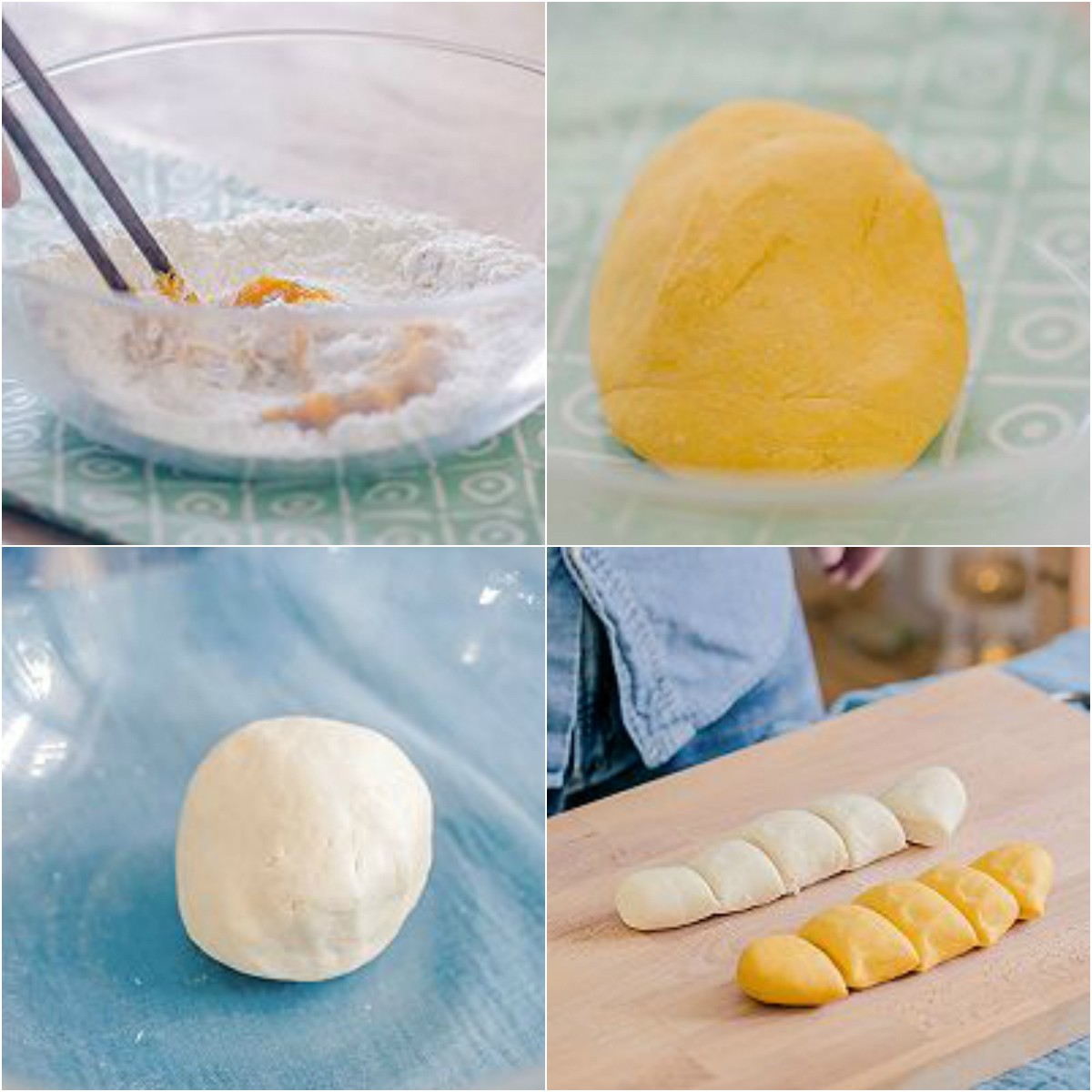 2. Đổ bí ngô nghiền vào bát bột sau đó trộn đều. Lưu ý chỉ trộn hỗn hợp khi bí ngô đã nguội bớt để không làm ảnh hưởng đến tác dụng của men nở. Sau khi trộn đều đến khi mịn bột thì nặn thành viên tròn. Làm tương tự với phần bột trắng, đổ sữa vào hỗn hợp trộn đều, lăn bột cho thành hình trụ rồi chia thành 5 đoạn.