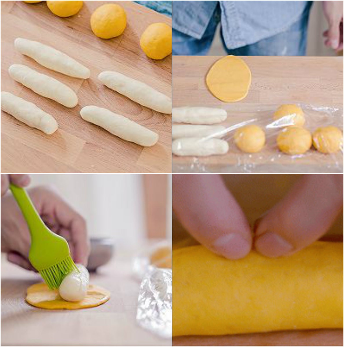 3. Vo tròn các phần bột màu vàng. Đối với phần bột màu trắng, bạn nặn thành các dải nhỏ bằng khoảng ngón tay. Dùng cọ phết 1 lớp dầu mỏng lên phần trắng và đặt lên phần bột vàng đã được đập dẹt. Dầu có tác dụng khiến cho lớp trong và ngoài không dính vào nhau, dễ bóc vỏ sau khi hấp.