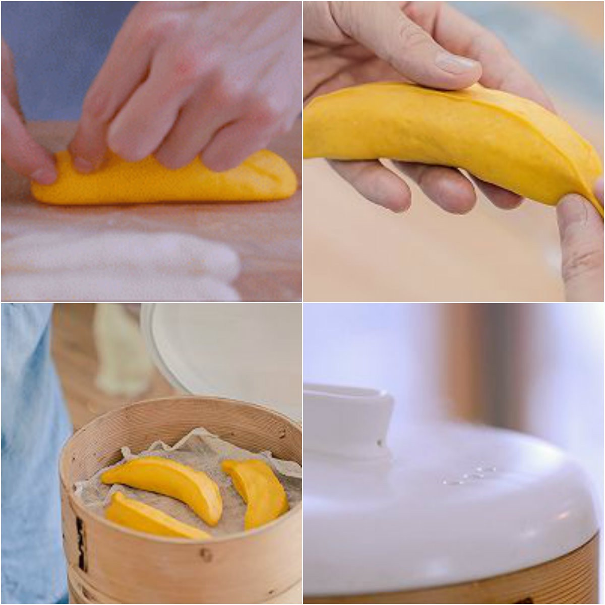 4. Sau đó bạn gập viền màu vàng vào và miết nhẹ tạo 1 cạnh của "quả chuối". Làm tương tự sao cho tạo thành 3 đường cạnh dọc thân. Chụm ngón tay tạo hình đầu và đuôi của "chuối" rồi đặt vào nồi hấp khoảng 12 phút. Chú ý không làm nước trên nắp nồi hấp rơi vào lồng hấp làm ướt "chuối" bên trong.