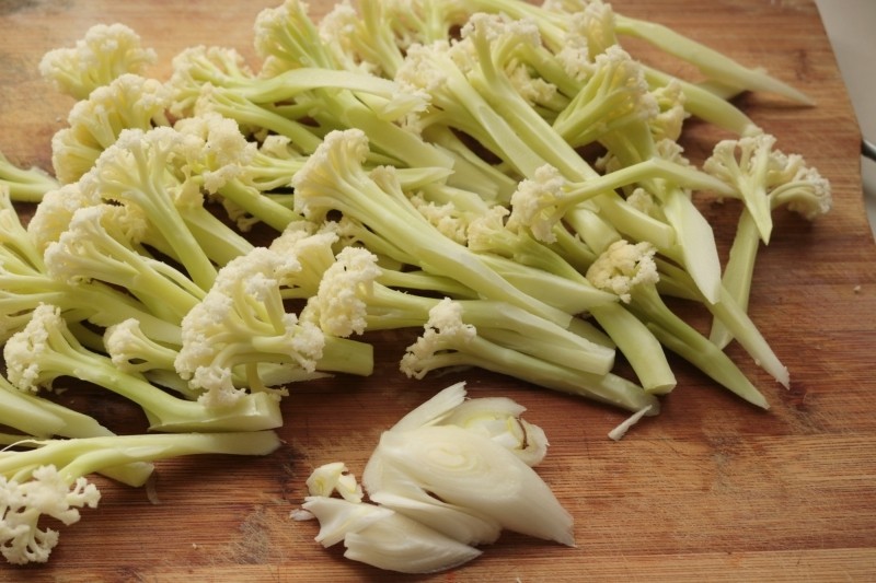 Ngâm súp lơ trong nước một lúc cùng muối loãng, sau đó rửa lại thật sạch và để ráo nước. Loại bỏ chỗ thân rễ già, sau đó tách dài và nhỏ. Đầu trắng của hành lá đem cắt nhỏ.