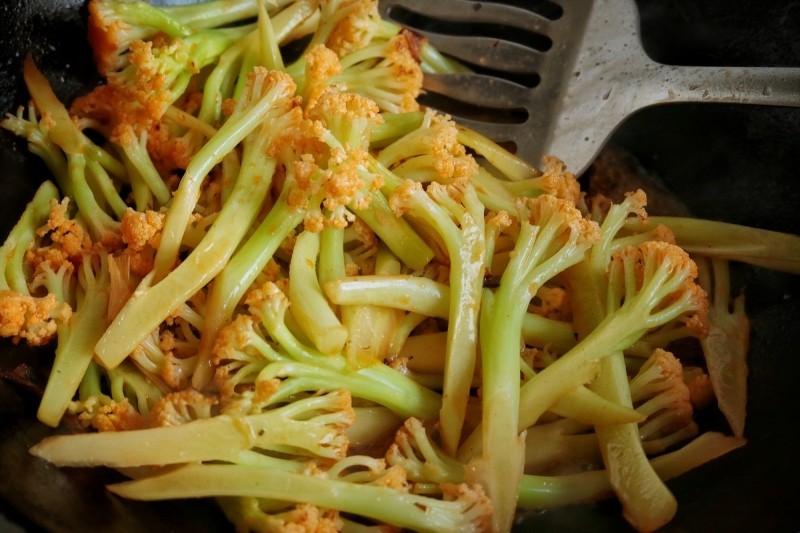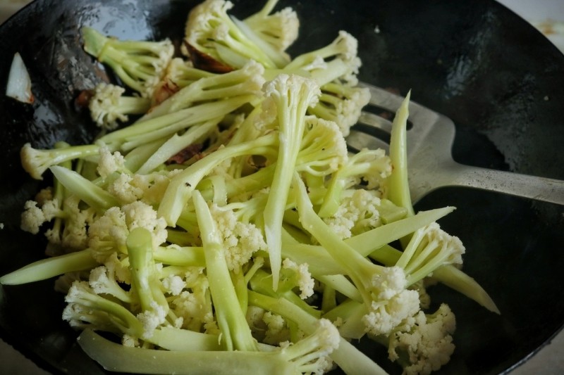 Thêm dầu đậu phộng vào chảo, chờ dầu nóng thì thêm hành lá xắt nhỏ xào cho thơm, sau đó thêm súp lơ vào chảo và đảo đều cho đến khi rau hơi mềm. Tiếp tục cho thêm một ít nước lọc vào chảo để rau giữ được độ ẩm.