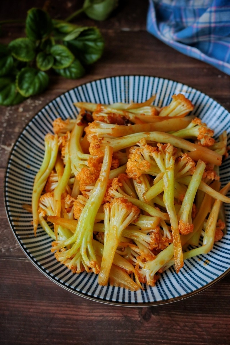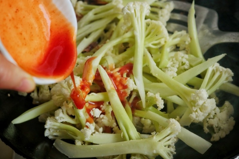 Thành phần: 400gram súp lơ, 1 phần hành lá, 25ml nước sốt cà chua, 10ml dầu đậu phộng.