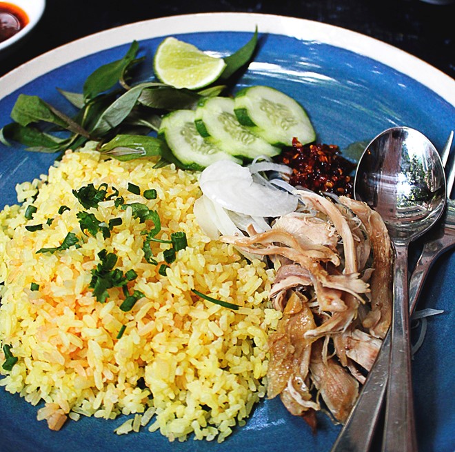 Cơm gà Hội An có thịt gà luộc và các loại rau ăn kèm.