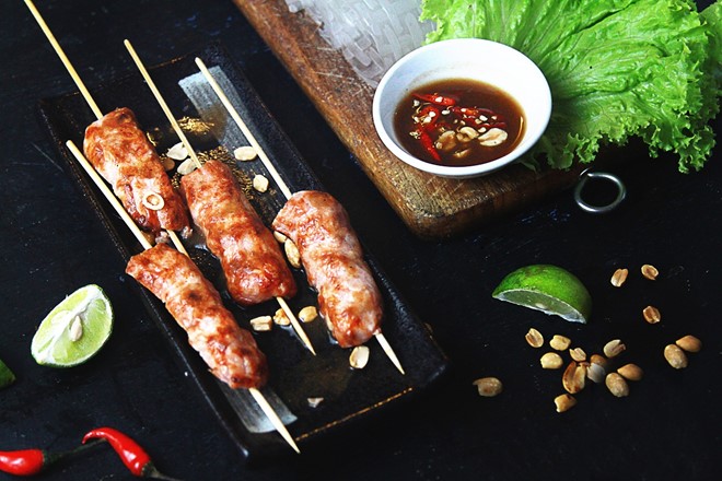 Nem nướng cuốn bánh tráng kèm rau sống, chấm nước sốt sền sệt là món được rất nhiều khách yêu thích.