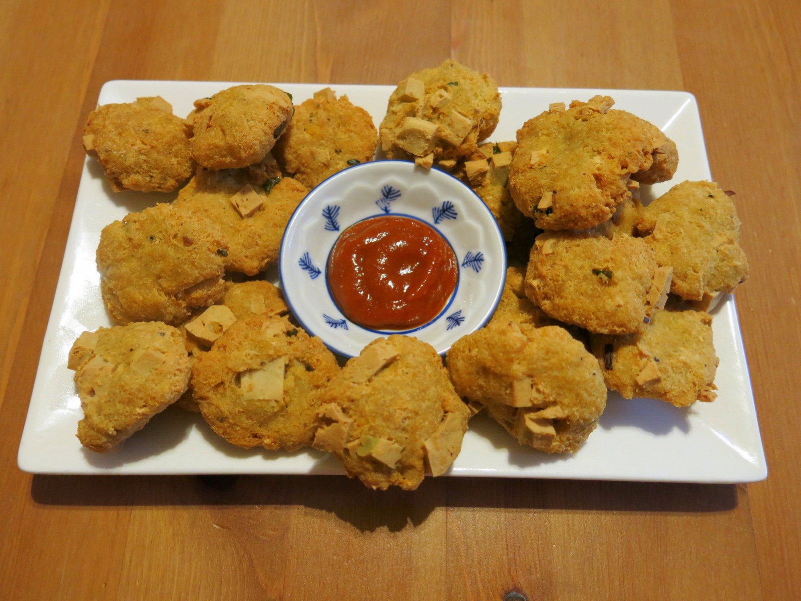 Hoặc nếu mọi người thích vị bùi bùi thì cho thêm đậu xanh hấp tán nhuyễn. Hình dưới đây là mình dùng đậu xanh hấp chín 100g và bớt lại 100g đậu hũ (1 bìa đậu) trộn chung với bột khoai tây, bột mỳ căn, chả lụa chay cắt nhỏ trộn chung cùng gia vị. Mình chấm chung với tương ớt ngon lắm!