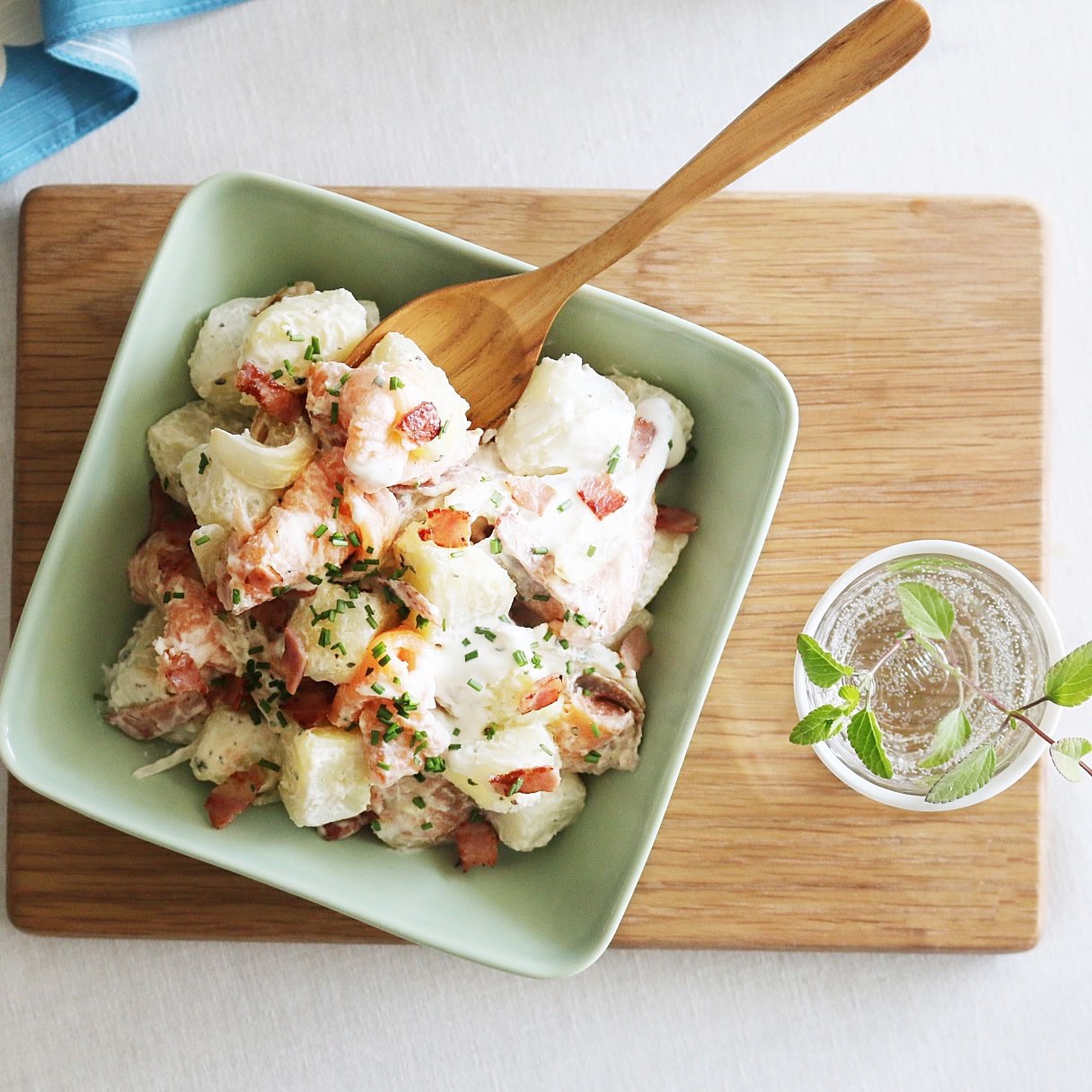 Cho khoai tây vào tô, thêm cá hồi xông khói, thịt xông khói và hành tây vào. Tiếp theo cho kem chua, nước cốt chanh, siro đường cùng chút muối và hạt tiêu vào trộn đều.