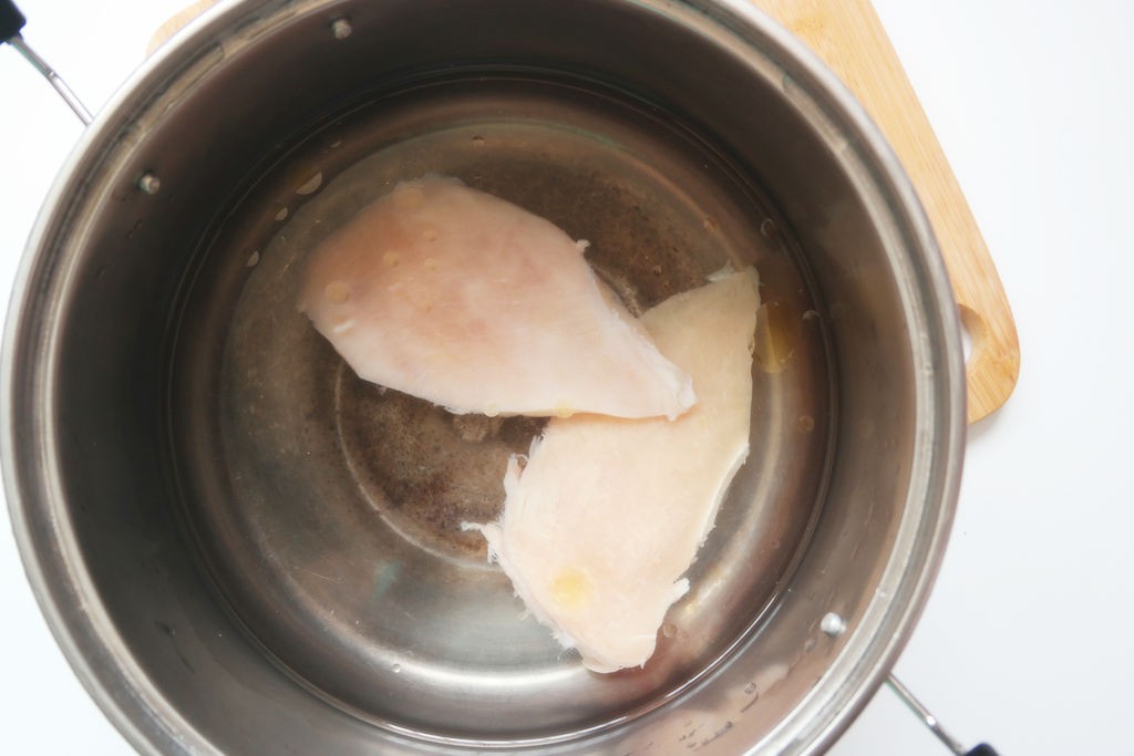 Thịt ức gà rửa sạch, cho vào nồi nước lạnh cùng muối, rượu, dầu oliu. Luộc sôi khoảng 10-15 phút hoặc cho đến khi thịt gà chín thì vớt ra đĩa.