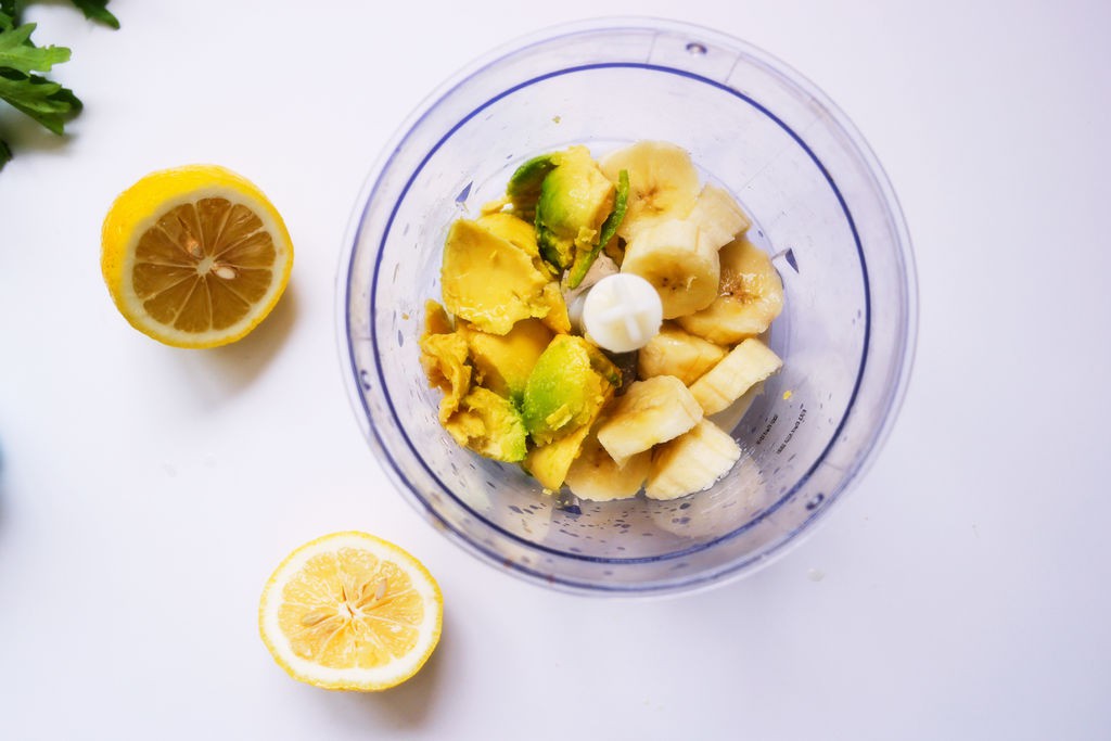 Bơ tách lấy phần thịt quả cho vào máy xay sinh tố, chuối bóc bỏ vỏ rồi cắt ngắn cho vào máy xay. Thêm nước cốt chanh, muối và sữa tươi vào.