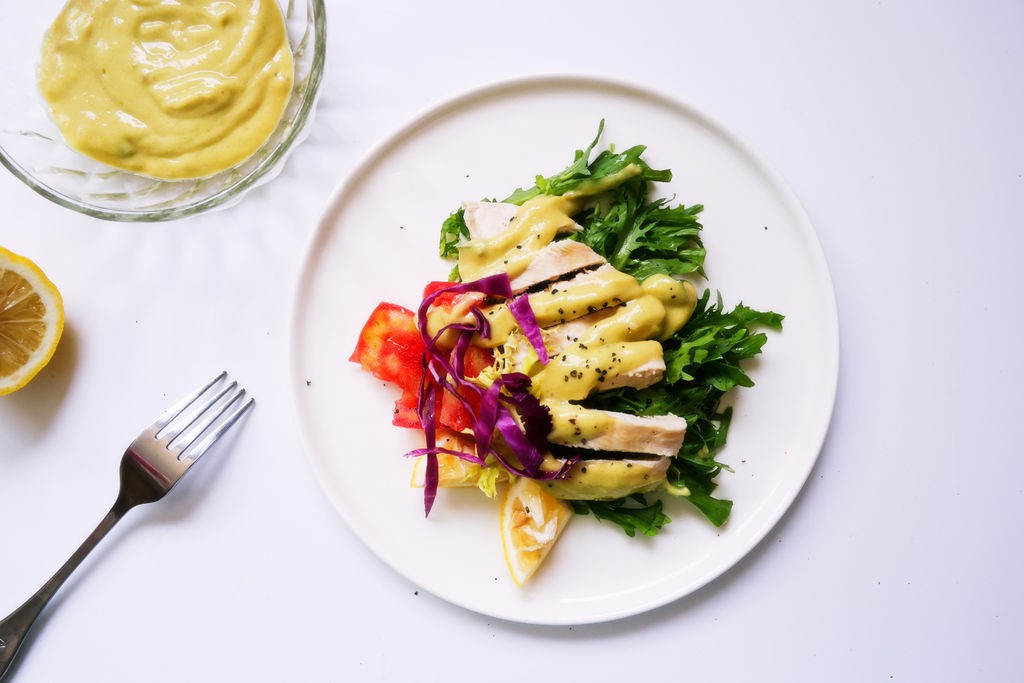 Salad gà là món ăn chế biến nhanh, thịt gà ăn kèm phần xốt bơ chuối ngọt ngào rất vừa miệng.