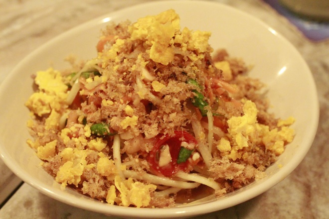 Gỏi đu đủ cá trê, tôm khô và trứng muối là một trong những khai vị được yêu thích trong các nhà hàng Thái ở Sài Gòn. Cá trê chiên xù, giòn tan cùng với vị bùi bùi của trứng muối, thêm ít đu đủ bào sợi rồi trộn chung với nước mắm chua ngọt, ăn hoài không thấy ngán.