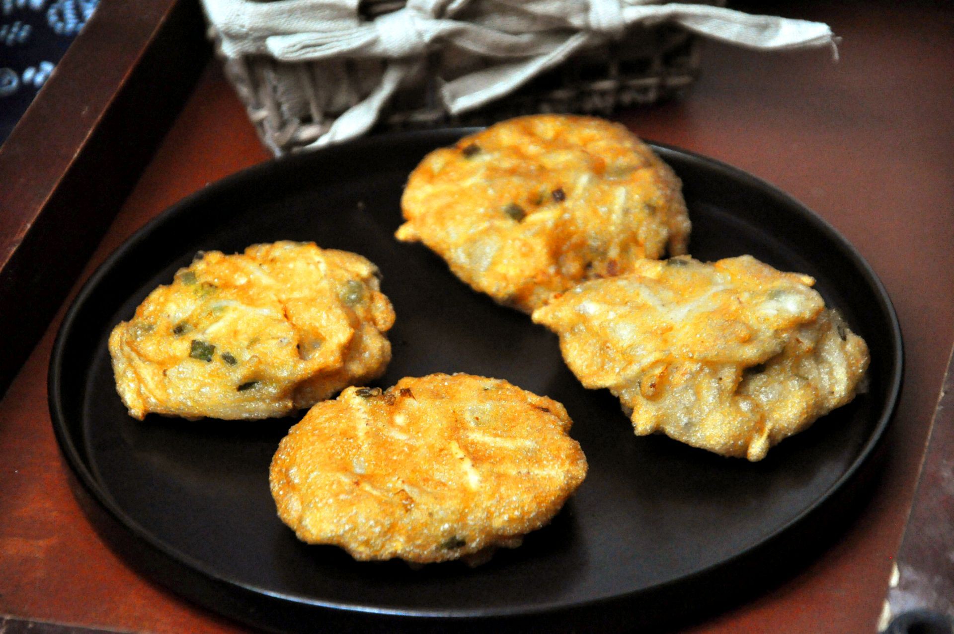 Bánh khoai chiên nóng hổi ăn giòn giòn, bên trong mềm ngọt vị củ cải, rất thích hợp khi thời tiết se lạnh.