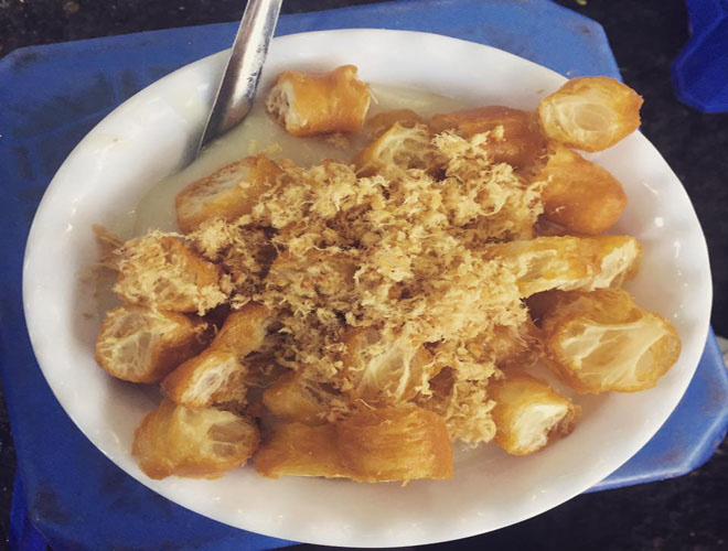 Cháo sườn sụn thường mở từ lúc 5h chiều, càng về đêm càng đông khách. Cháo ở đây được ninh nhừ, nhuyễn như bột, đặc sánh, thơm mùi thịt và ngọt vị nước hầm xương. Cháo thường được ăn kèm với quẩy nóng và ruốc cho hương vị đậm đà hơn. Giá một bát cháo sườn sụn là 30.000 đồng, có kèm thêm quẩy là 35.000 đồng. Ảnh: Chinh Lê.