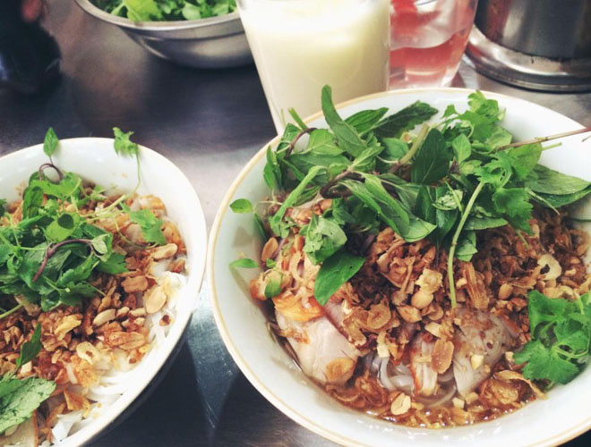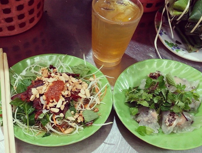 Bánh bột lọc thường được bán cùng quán với nộm bò khô, có giá 20.000 đồng một đĩa. Bánh có nhân đậm đà, nước chấm chua ngọt rất ngon. Cửa hàng sạch sẽ nên đông khách thưởng thức. Ảnh: Aophie Dang.