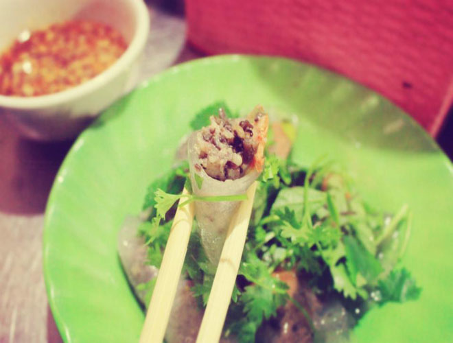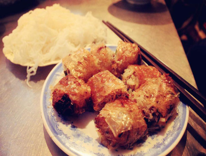 Bún nem cua bể là món ăn biến tấu của bún chả. Thay vì ăn chả, người ta ăn bún với những chiếc nem rán vàng ruộm, thơm mùi vị đặc trưng của cua bể. Nem ngon phải là nem được làm từ gạc cua biển Hải Phòng, mình dày, nặng từ 0,5 đến 1 kg. Giá một suất bún nem cua bể là 30.000 đồng, thêm nem, giá từ 7.000 đên 10.000 đồng một cái. Ảnh: Tin Phạm.